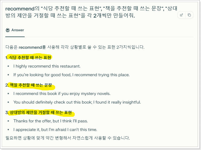이 과정에서 퍼플렉시티는 단순히 번역만 해주는 게 아니라, 상황별 예문을 다양하게 제시해 줍니다. 덕분에 ‘recommend’ 하나만 공부했는데도 실제 대화에서 써먹을 수 있는 표현이 4~5개 이상 생기게 되죠. 이런 식으로 매일 조금씩 단어를 확장해 나가다 보니, 교재로 공부하는 것보다 훨씬 재미있고 실제 생활에 가깝게 연습할 수 있었습니다. 무엇보다 번역 기능을 활용하면서 제가 직접 쓰고 싶은 상황을 만들어 나갈 수 있다는 점이 가장 좋았습니다.