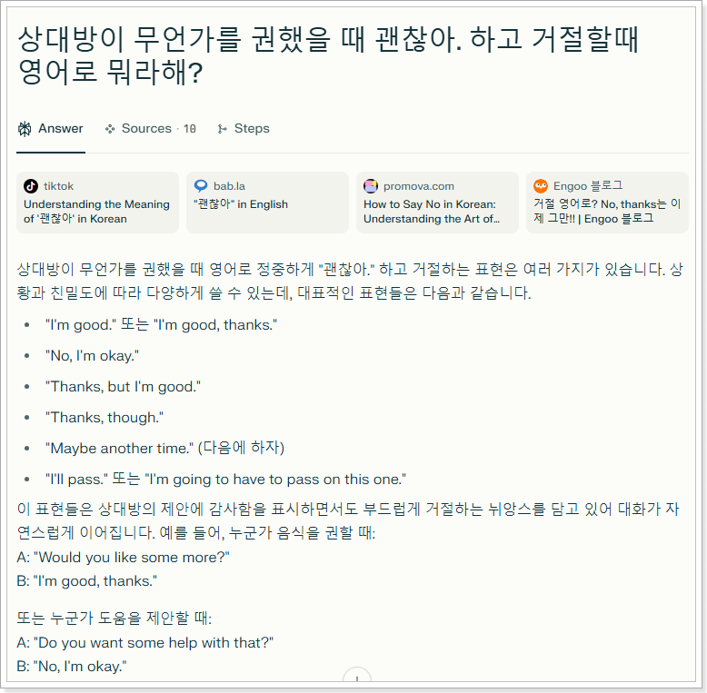 저는 외국인 친구가 메시지로 “Do you want some help with that?”라고 물어본 적이 있었는데, 순간 대답이 막혔습니다. 그냥 “괜찮아”라고 말하고 싶은데, 영어로 어떤 표현이 자연스러울지 헷갈렸거든요. 이럴 때 퍼플렉시티 번역 기능을 활용했더니 “I’m good, thanks.”나 “No, I’m okay.” 같은 정중하면서도 간단한 표현을 제안해 주더라고요. 덕분에 어색하지 않게 대화를 이어갈 수 있었습니다. 이렇게 실시간 번역은 단순히 단어 뜻을 알려주는 것을 넘어 상황에 맞는 자연스러운 문장을 알려준다는 점에서 특히 만족스러웠습니다.