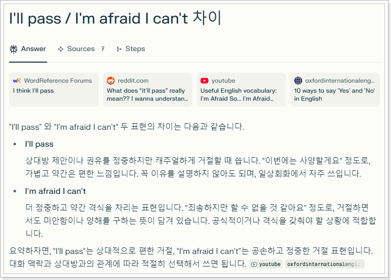 영어 문장은 단어 하나 차이로 분위기가 완전히 달라질 때가 많습니다. 예를 들어 “I’ll pass.”라는 표현은 가볍게 거절하는 느낌이지만, “I’m afraid I can’t.”은 조금 더 정중한 뉘앙스를 담고 있습니다. 이처럼 같은 의미의 거절도 상황에 따라 다르게 써야 하는데, 퍼플렉시티 번역 기능은 이런 뉘앙스를 잘 잡아줍니다.