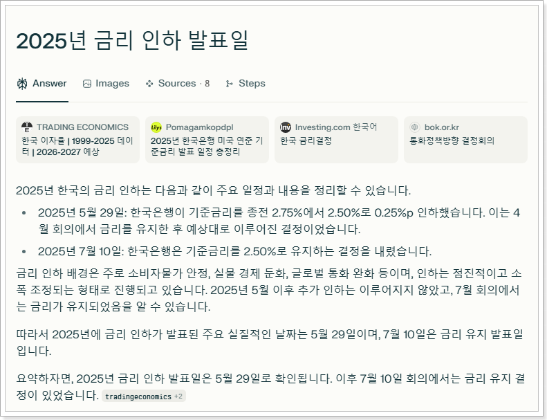 퍼플렉시티는 기본적으로 AI 검색 엔진입니다. 마치 구글처럼 실시간 웹에서 정보를 찾고, AI가 그 내용을 정리해서 보여줍니다. 답변에 항상 ‘출처 링크’가 있어서 정보를 검증하기 좋습니다. 예를 들어 “2025년 금리 인하 발표일”을 물어보면, 최신 뉴스 기사나 공식 자료를 찾아 출처와 함께 알려주죠.