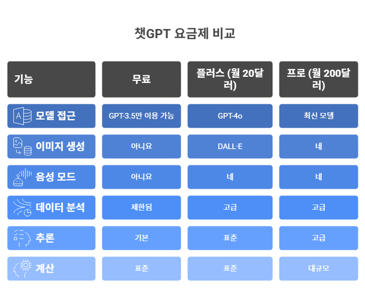Plus (월 20달러): GPT-4o 접근, 이미지 생성(DALL·E), 음성 모드, 고급 데이터 분석