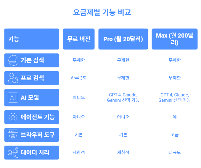 Max (월 200달러): 에이전트 기능, 고급 브라우저 도구, 대규모 데이터 처리